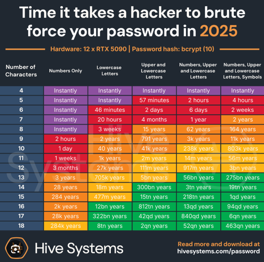 When it comes to password protection, length matters. Longer passwords are inherently more secure than shorter ones. This is because a hacker has to try out more combinations with longer passwords. This takes longer and makes hacking more difficult. A password that consists of 1 lowercase letter has 26 combinations. A 2-letter password already has 26 x 26 = 676 possible combinations. An 8-letter password already has 208 billion possible combinations of letters, while a 12-character password has as many as 95 quadrillion possible combinations. So, the longer a password, the more computing power and time hackers need to systematically try each combination, making it harder to crack the password.
