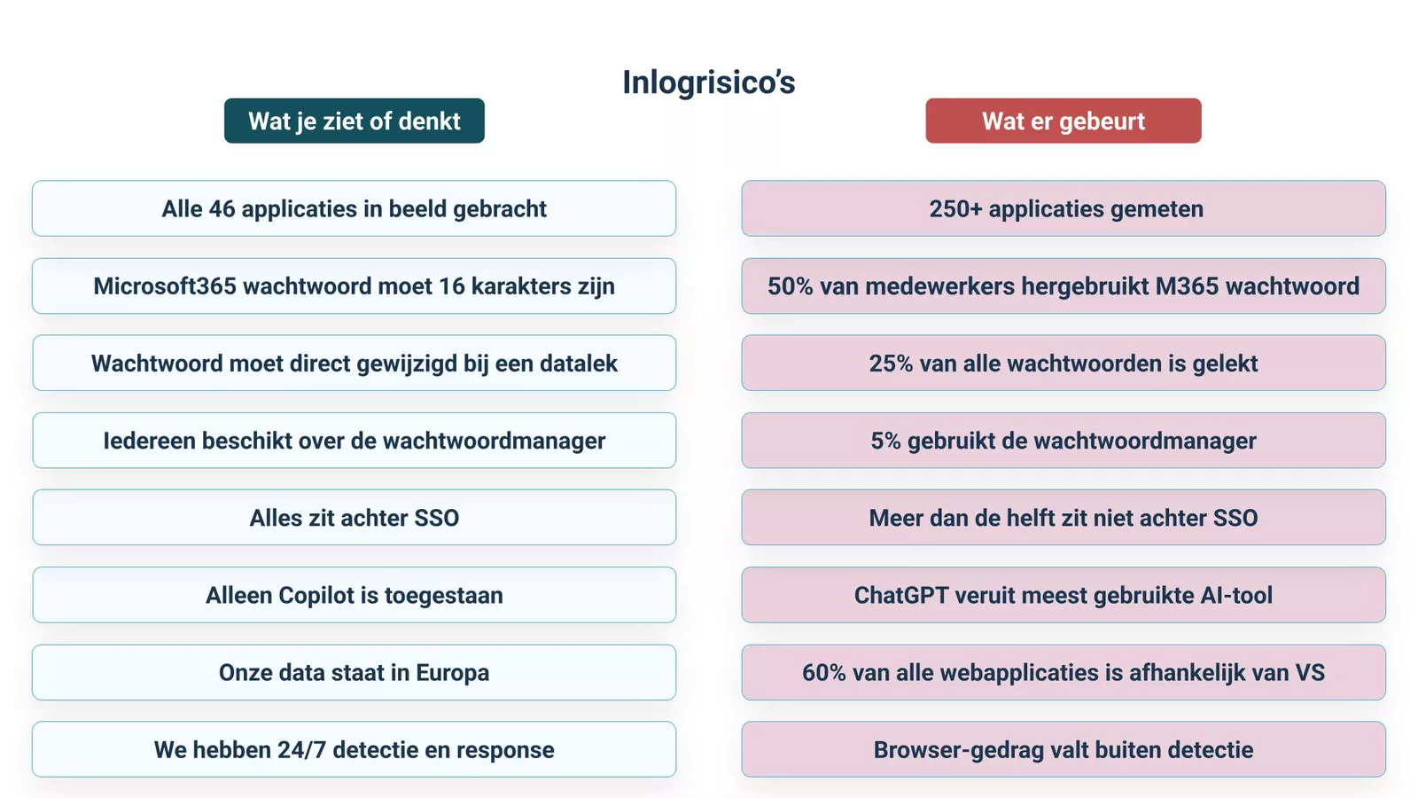 Die metingen vinden plaats in de browser, waar medewerkers daadwerkelijk inloggen op applicaties. Vanuit daar ontstaat een data-gedreven beeld van het applicatielandschap, het gebruik van wachtwoorden en de effectiviteit van bestaande beveiligingsmaatregelen. Rick: “De gebruiker gaat naar de browser en vanaf daar gaat hij inloggen en verdwijnt hij eigenlijk steeds verder buiten beeld.” Juist dat deel van het digitale gedrag blijft bij veel organisaties onzichtbaar.