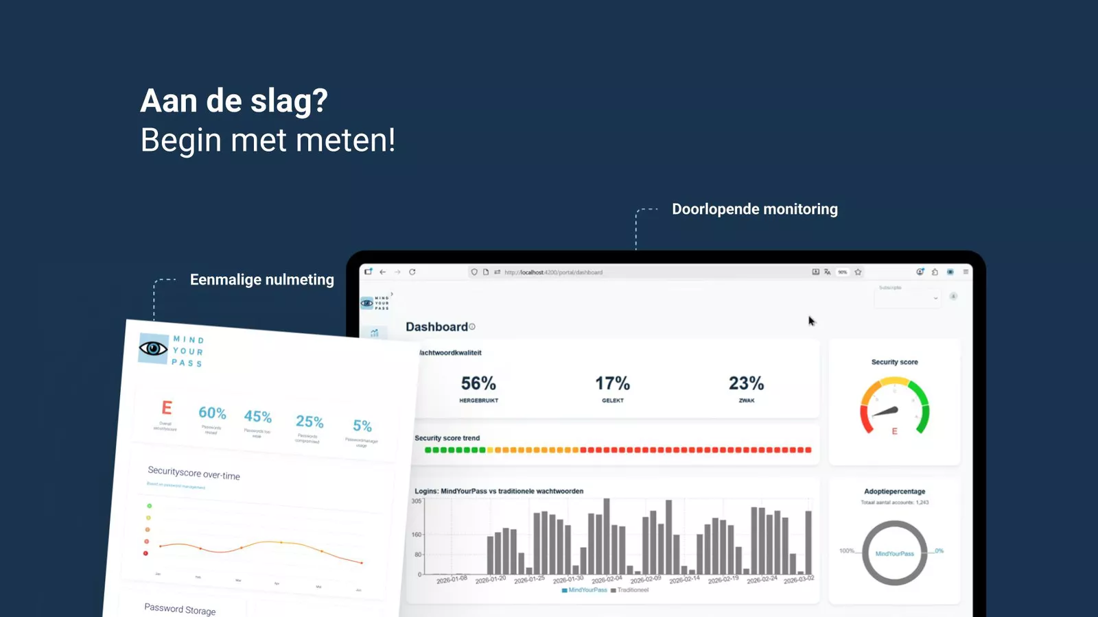 Elke verandering begint met het verkrijgen van volledig inzicht in de huidige situatie. Om vanuit daar met behulp van een concreet en praktisch plan toe te werken naar de gewenste situatie: het gebruik van kwetsbare wachtwoorden binnen jouw organisatie onmogelijk maken.