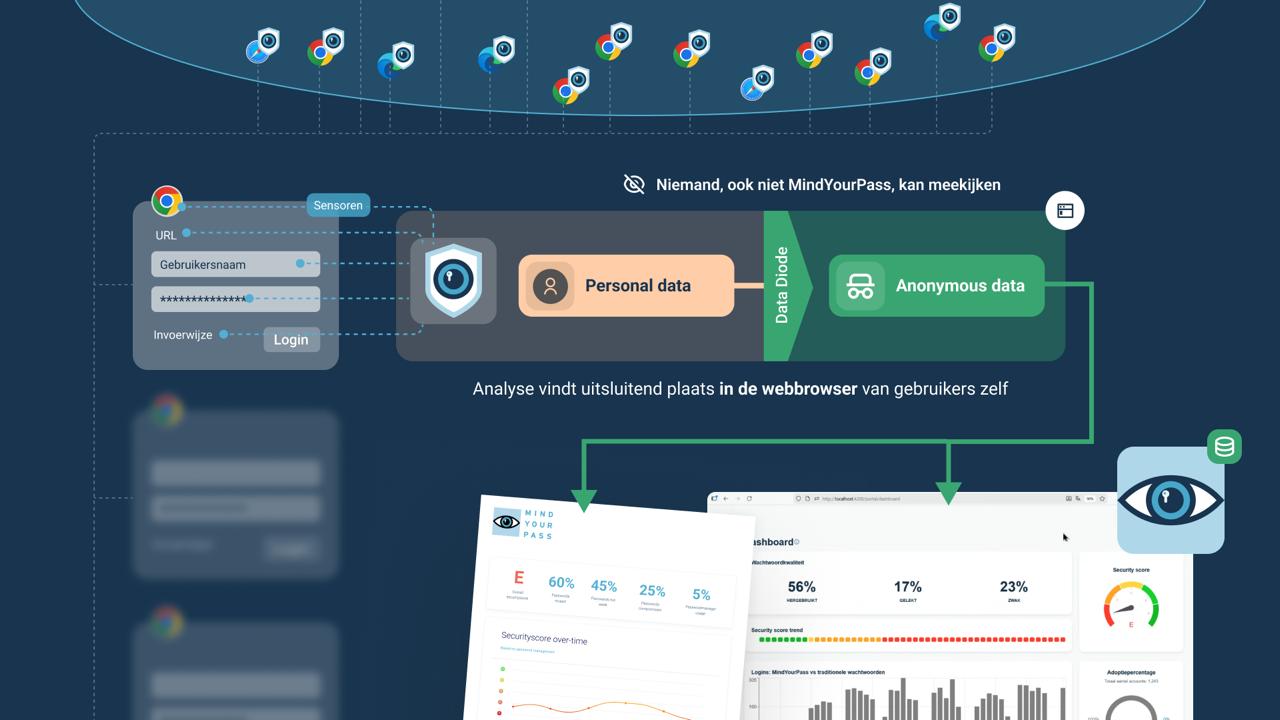 Om inzicht te krijgen in het daadwerkelijke inloggedrag, gebruikt MindYourPass een privacy-friendelijke browserextensie die door organisaties zelf wordt uitgerold op de browsers van medewerkers. Deze software staat los van de wachtwoordmanager en heeft als specifiek doel om inzicht te krijgen in de veiligheid van alle logins.